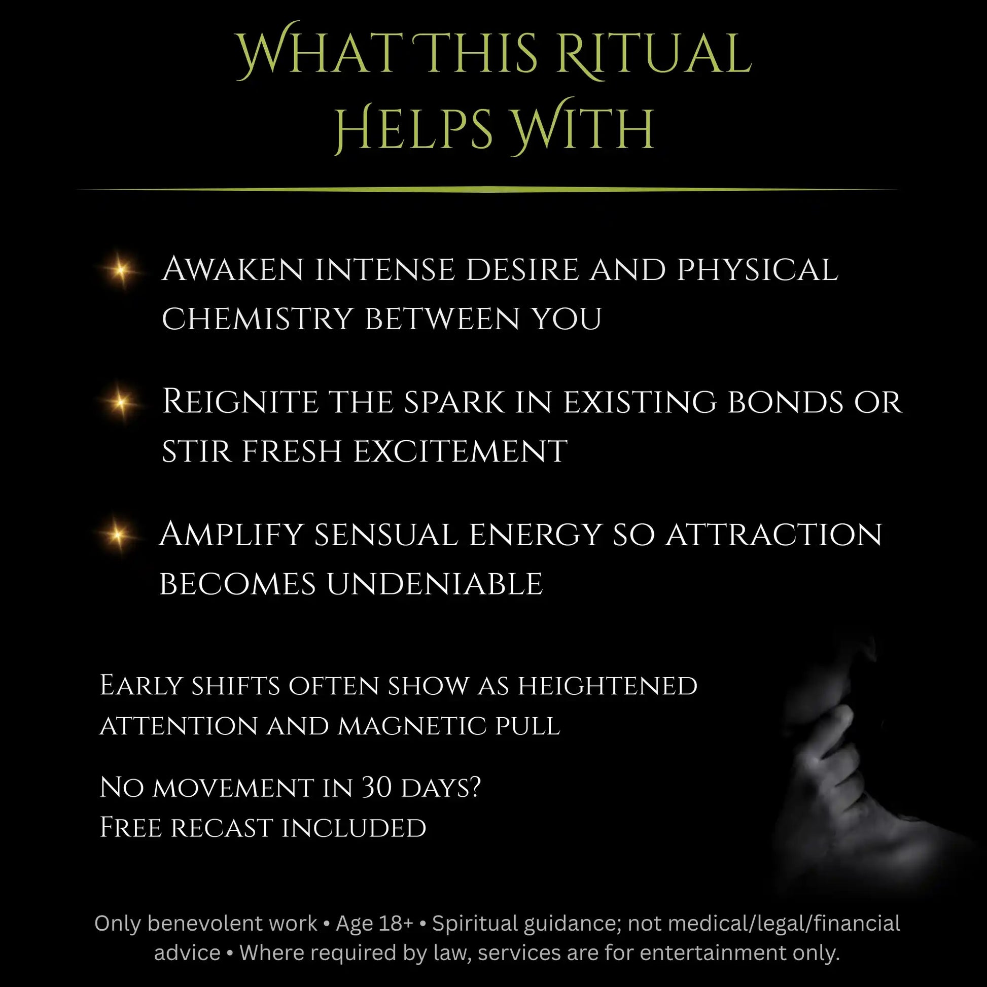 As with all my magic, I do not cast on situations that feel coercive, harmful, or unsafe. The intention here is to deepen mutual attraction and sensual connection where it can be healthy for both people, not to override someone’s true path or boundaries.
